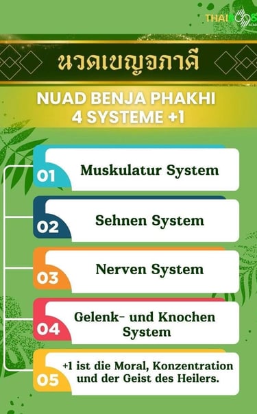 4 Systeme + 1, wobei mein Lehrer, Herr Suthep Miwattana, der Begründer dieser Massagetechnik ist, die eine Alternative darstellt, bei der man nicht auf Medikamente, Spritzen oder Operationen angewiesen ist.